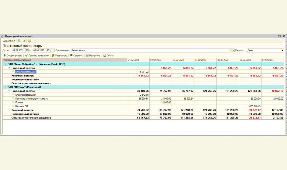 - в случае возникновения кассовых разрывов доступна возможность перепланирования денежных средств непосредственно в самом платежном календаре;