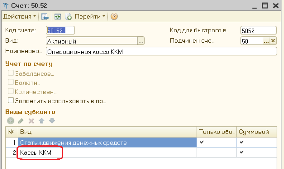 - ведение учета по счету 50.52 в разрезе аналитики «Кассы ККМ»;